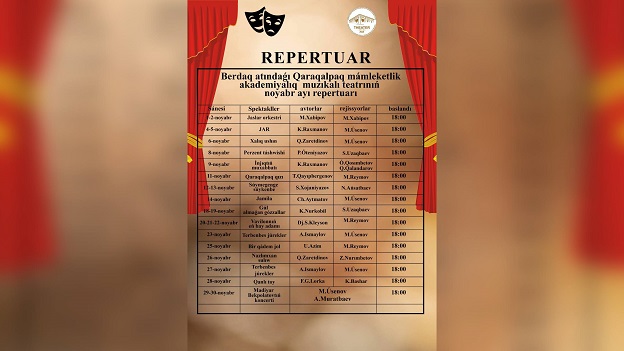 #REPERTUAR🎭Berdaq atındaǵı Qaraqalpaq mámleketlik akademiyalıq muzıkalı teatrınıń noyabr ayı repertuarı.