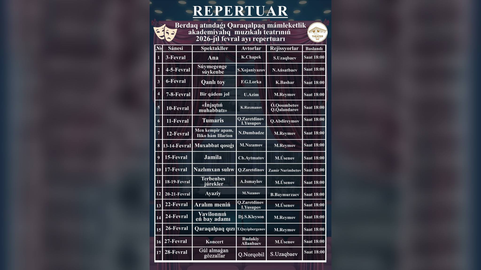 #REPERTUAR🎭Berdaq atındaǵı Qaraqalpaq mámleketlik akademiyalıq muzıkalı teatrınıń 2026-jıl fevral ayı repertuarı.